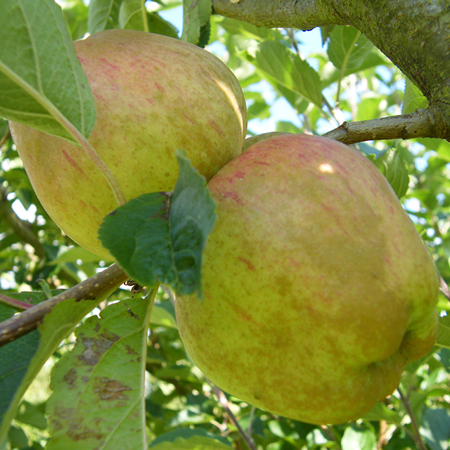 Golden russeted fruit, ripe in September. Unique flavour and texture, sometimes compared to a banana. Very popular with gardeners looking for a different taste to add to their collection. Found in a garden in the south of Ireland in 1890 by Baylor Hartland of Ard Cairn nursery, Co. Cork. Received an RHS Award of Merit in 1910.
