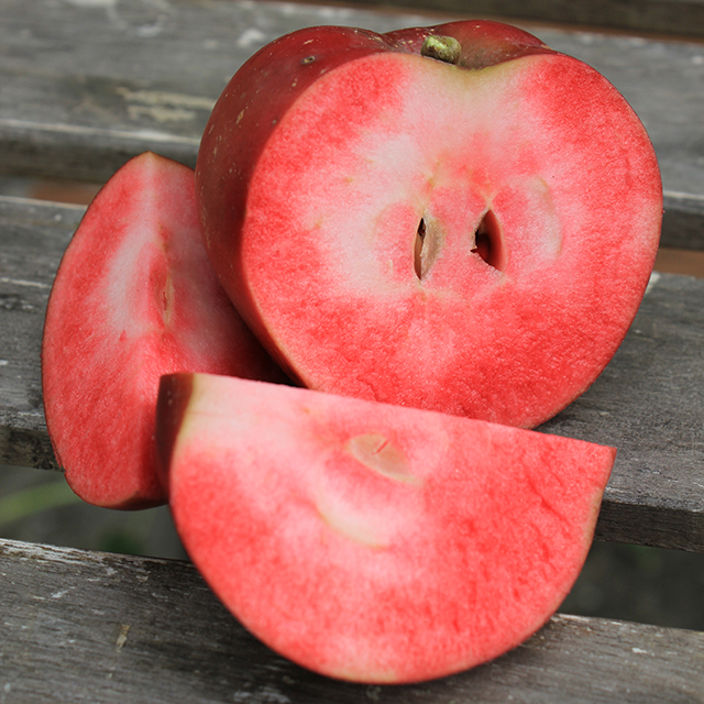 A very attractive variety with beautiful prolific pink blossoms in Springtime; foliage has a slight purple vein; and the fruit in autumn is deep crimson with crimson coloured flesh. Excellent for jams and jellies, but also large enough for tarts. A variety found growing at Belvedere House, Mullingar, Co. Westmeath. Its true identity is yet to be established. But it has attracted much attention from visitors to our research orchard, both at flowering time and again when in fruit.