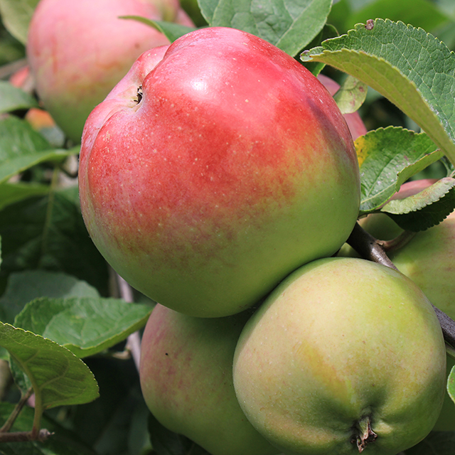 Large and distinctive. Red & yellow colouring looks particularly decorative. Eaten fresh from the tree, it has a mild flavour. Also suitable for cooking. Heavy crop, good disease resistance. Associated with counties Kilkenny, Meath and Offaly in early 20th century.